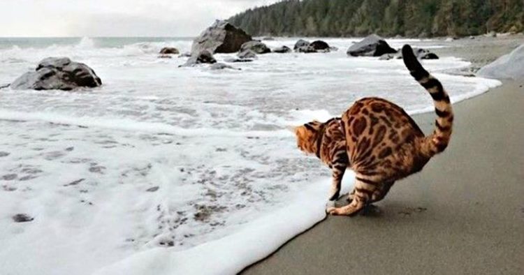 Who could have possibly thought it was a good decision to take a cat to the beach initially? The enjoyment and thrill might start the moment you step into the water. This image appears to be a candid shot. The timing of the capture is commendable. The photographer has effectively depicted an incredibly striking pose.