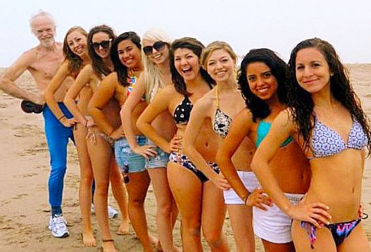 Following the idea of beach photobombing, this particular instance seems to have been arranged intentionally. A group of attractive young women encircle an elderly man renowned for his kind-heartedness, positioned towards the rear. The video suggests that the photo shoot was highly enjoyable. The individual who proposed the concept should be commended for their ingenuity. I plan to replicate this with my friends on my next beach visit!